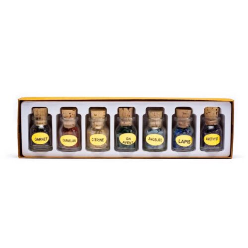 Sæt med 7 glas gaveflasker med ædelsten i chakrafarverne: Granat, carnelian, citrin, grøn aventurin, angelite, lapis lazuli og ametyst.