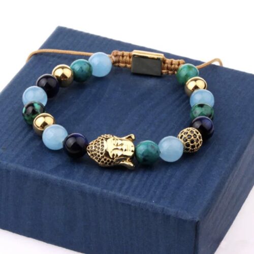 Vores macramé armbånd er skabt med hjertet og sjælen og kombinerer de kraftfulde egenskaber af blå tiger sten, chrysocolla og blå jade med et inspirerende Buddha hoved. Dette armbånd er mere end blot smykker; det er en invitation til at finde balance, indre ro og positiv energi.