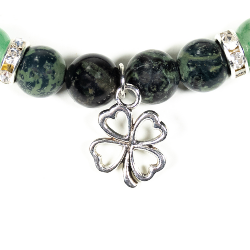 Elastisk armbånd lavet af kambaba jaspis og grøn aventurin med heldig kløver charme. Kambaba jaspis er en grågrøn jaspis og har en jordforbindelse og beskyttende virkning. Denne sten hjælper med at overvinde frygt for konflikt og får dig i kontakt med din indre styrke. Fremmer mod, beslutsomhed, selvsikkerhed og modstandsdygtighed. Kambaba jaspis absorberer negative energier og beskytter mod stråling og (miljø) forurening. På et fysisk plan understøtter kambaba jaspis blodcirkulation, fordøjelse, tyktarmen og funktionen af kønsorganer. * Aventurine hjælper dig med at gøre dine drømme til virkelighed. Det stimulerer beslutningstagning, entusiastisk indsats og kreativitet. Dette produkt er nikkel-, bly- og cadmiumfrit. hvilket betyder, at sådanne elementer ikke er til stede eller i de begrænsede mængder, der er tilladt inden for de europæiske produktsikkerhedsstandarder.