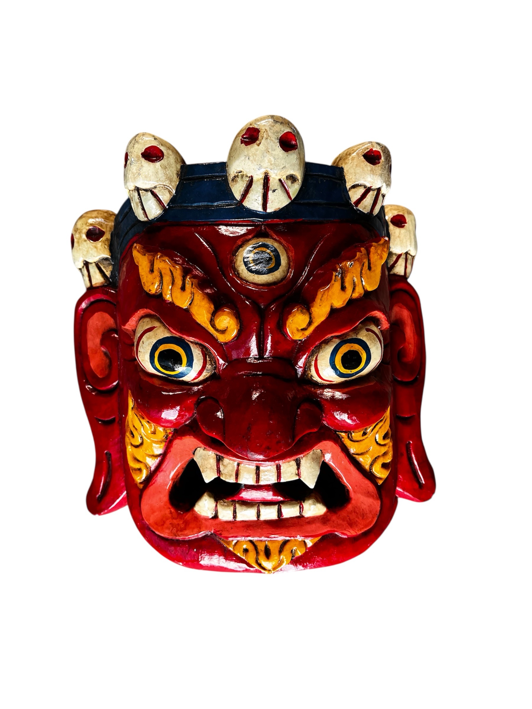 - Dekorative kranier: De mange kranier, der pryder masken, symboliserer Bhairabs herredømme over døden og det cykliske aspekt af liv og død.