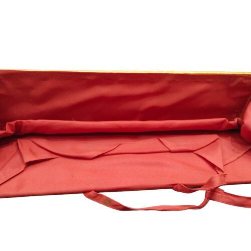 Denne tekstholder er fremstillet af solidt træ og beklædt med traditionelle buddhistiske mønstre og symbolik. Den rige, gyldne dekoration på ydersiden bringer den buddhistiske kultur og historie ind i din praksis. Den indre del er foret med blødt stof, der forsigtigt beskytter dine tekster mod skader.