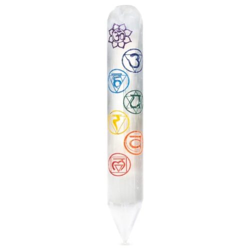Selenit (satin spar) massagestav med de 7 chakrasymboler indgraveret. Til brug ved massage eller krystalterapi. Den spidse spids er særligt velegnet til akupressur eller triggerpunkt-massage.