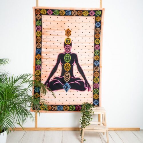 Opdag dybden af spiritualitet og farverig kunst med vores Chakra Meditation Vægtæppe. Dette tæppe, som er håndlavet i Jaipur, Indien, fremstiller den menneskelige silhuet i meditation, omgivet af de syv chakra-symboler. Det er en ideel tilføjelse til ethvert rum, der bruges til meditation, yoga eller som et spirituelt centrum i dit hjem.