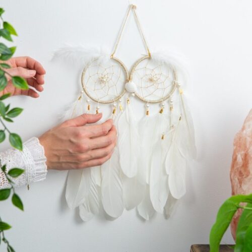 Uglen har længe været et symbol på visdom og indsigt. Denne drømmefanger forener dette gamle symbol med traditionen for at fange drømme, hvilket skaber en kraftfuld spirituel genstand. Den er udsmykket med perler og fjer, som tilføjer elegance og en visuel lethed.