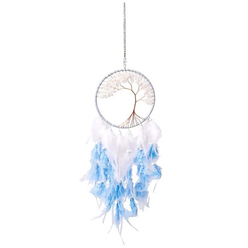Denne smukke drømmefanger er mere end bare en dekoration – den inviterer til ro, symbolik og nærvær i dit rum. Ringen er prydet med livets træ, som symboliserer styrke, vækst og forbundethed, og fjerene danser i sarte nuancer af hvid og blå.