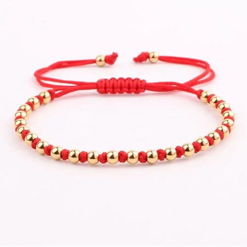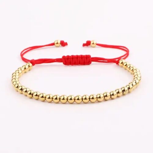 Den tredje del præsenterer en fortryllende kombination af rød snor og små guldfarvede metalperler, der elegant er viklet sammen. Dette kunstværk repræsenterer en fusion af stilarter og skaber et dynamisk udtryk for individualitet.