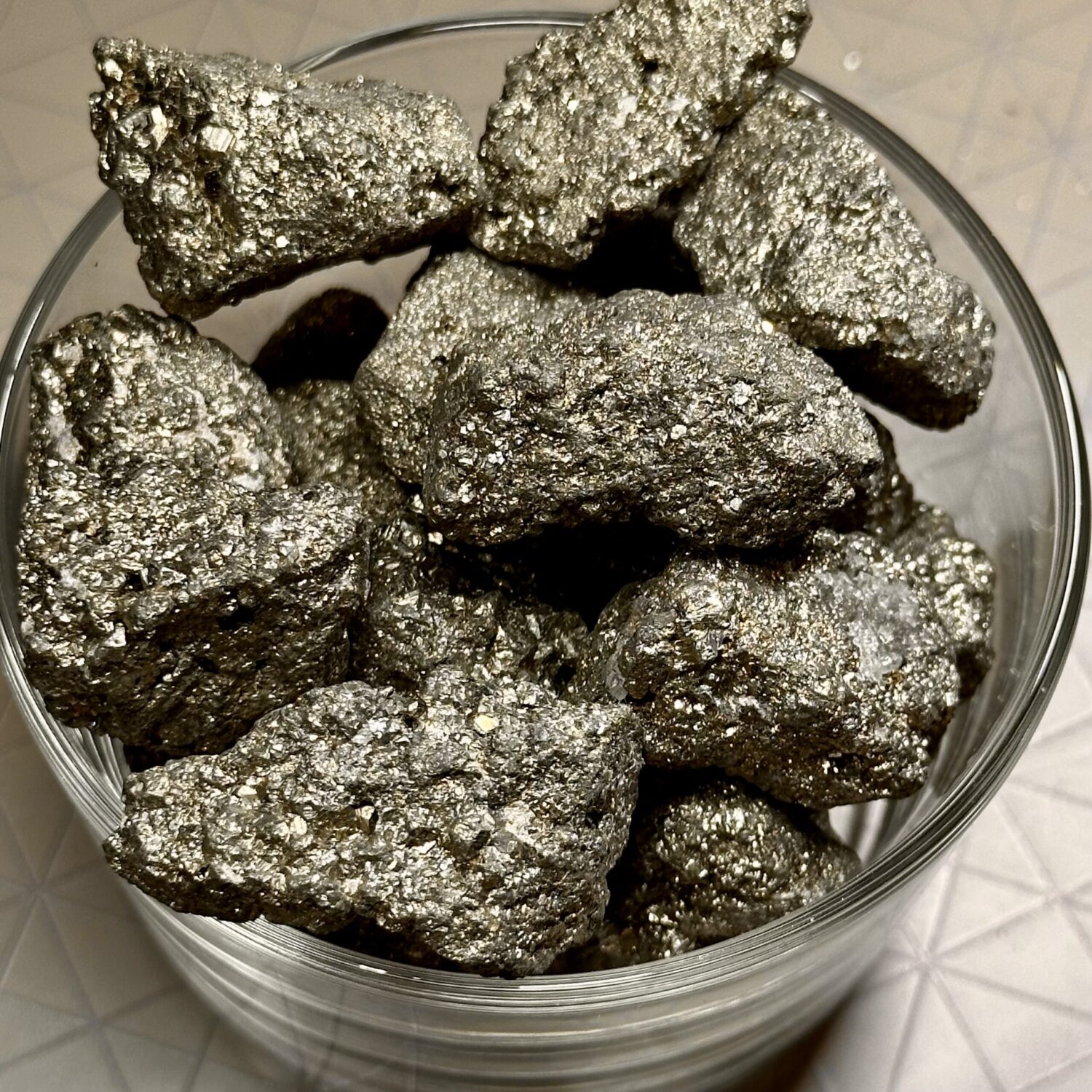 Den kaldes ofte Fool’s Gold, fordi den glimter som guld – og det er faktisk lige præcis dét, der gør den så fascinerende. Pyrit ser ikke bare eksklusiv ud… den føles også som en sten med power.