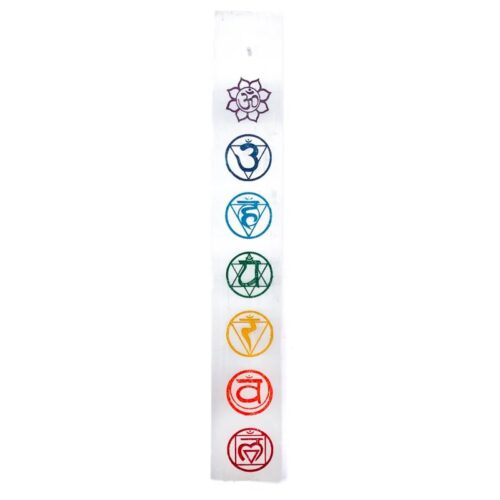 Selenit (satin spar) røgelsesholder med de 7 chakrasymboler indgraveret i farver. Til afbrænding af tynde røgelsespinde.