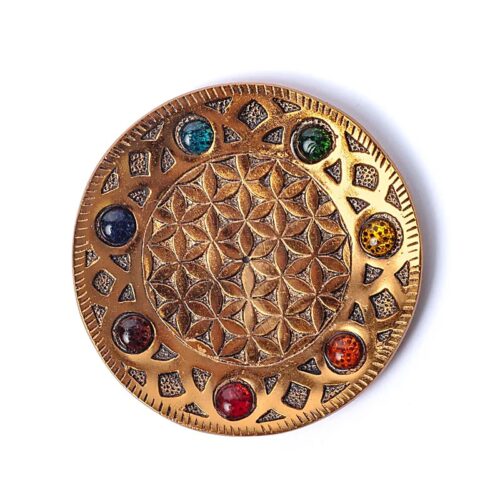 Røgelsesholder med Livets Blomst-symbol og perler i de 7 chakra-farver.