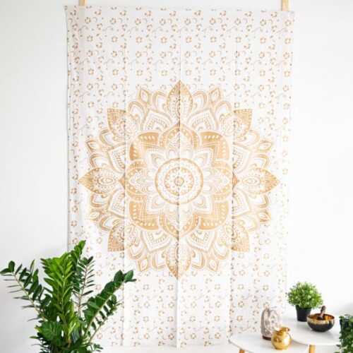 Tilføj en unik og autentisk skønhed til dit hjem med dette håndlavede vægtæppe, der er fremstillet i Jaipur, Indien. Dette vægtæppe, prydet med et smukt mandala-motiv i gyldne toner, bringer både ro og elegance til enhver væg.