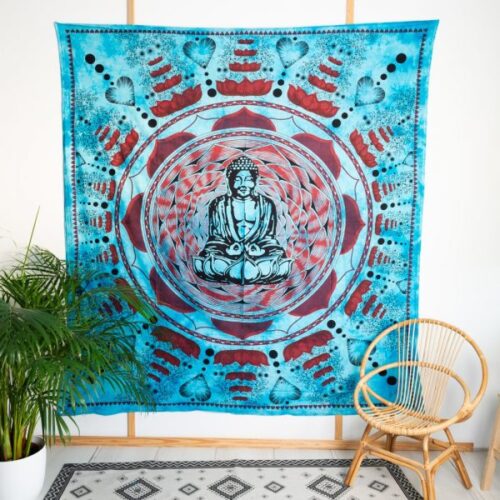 Dette smukke og unikke bomuldsvægtæppe er håndlavet i Jaipur, Indien, og fremstiller en fredfyldt Buddha i meditation omgivet af en dynamisk blå farvepalet. Perfekt til at tilføre ro og spiritualitet til ethvert rum.