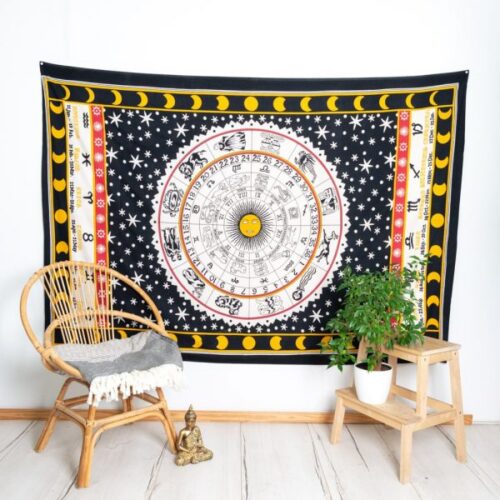 Oplev den mystiske skønhed og håndværksmæssige kvalitet i dette autentiske vægtæppe med horoskopmotiv, fremstillet i Jaipur, Indien. Dette unikke vægtæppe er designet til at tilføje en spirituel og dekorativ dimension til ethvert rum.