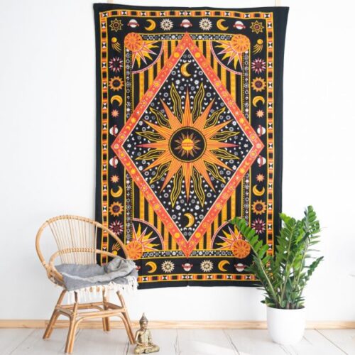 Dette håndlavede bomuldstæppe er en sand kunstskat fra Jaipur, Indien. Det levende design af Solen og Månen gør det til mere end bare en vægdekoration. Dette er et spirituelt kunstværk, der bringer harmoni og balance til ethvert rum.